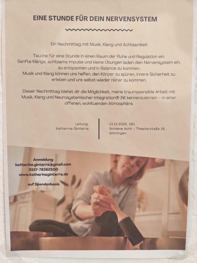 lebeliebejetzt in Göttingen, geleitet von Marie-Sophie von Düring, bietet eine einzigartige Verbindung aus Gesang, Klangtherapie und psychotherapeutischer Begleitung. Im Mittelpunkt stehen die Förderung von innerem Gleichgewicht, Selbstentfaltung und ganzheitlichem Wohlbefinden durch Klang, Stimme und kreative Methoden – auch online.